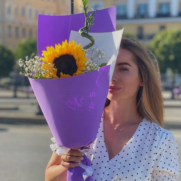 Очень красивый букет из солнечного подсолнуха, ветки бамбука, и шариков гипсофилы