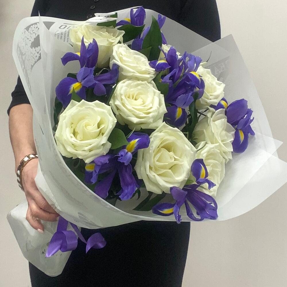 розы - 9 шт.ирисы - 6 шт.Рускус сочи - 9 шт.Упаковка дизайнерская - 1 шт.Лента - 1 шт.