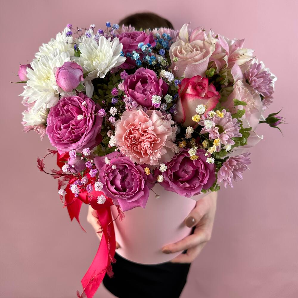 Гортензия - 2 шт. Рускус - 5 шт. Хризантема кустовая - 2 шт. Роза одноголовая - 3 шт. Коробка - 1 шт. Оазис флористический - 1 шт. Мини открытка - 1 шт. гипсофила радужная - 1 шт. диантус нежно розовый - 3 шт. пионовидная кустовая роза мисс баблз - 3 шт.
