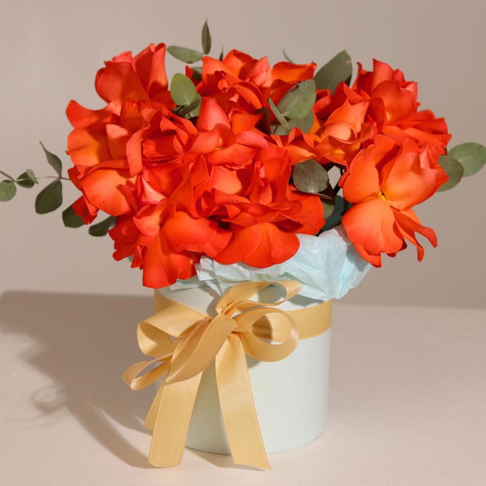 Эта удивительная композиция из ярко-оранжевых французских роз и свежего эвкалипта, оформленная в стильном боксе, станет шикарным подарком для девушки, жены, любимой, подруги. Насыщенные цвета роз наполнят атмосферу теплом и радостью, а зелень эвкалипта добавит нотку свежести и элегантности. Такой букет станет прекрасным знаком внимания для мамы или любимой жены, подчеркивая вашу заботу и любовь. Подарите эту изысканную композицию, и она обязательно создаст незабываемые моменты счастья и вдохновения.