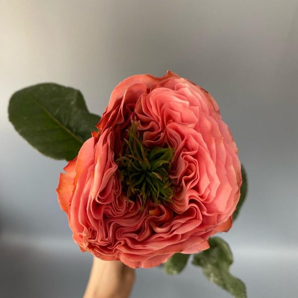 Персиковая Роза с очень крупной луковицей и ярко-зеленым глазком, выглядывающим из центра. Роза окрашена в мандариновый цвет,создавая притягательный взрыв красок.