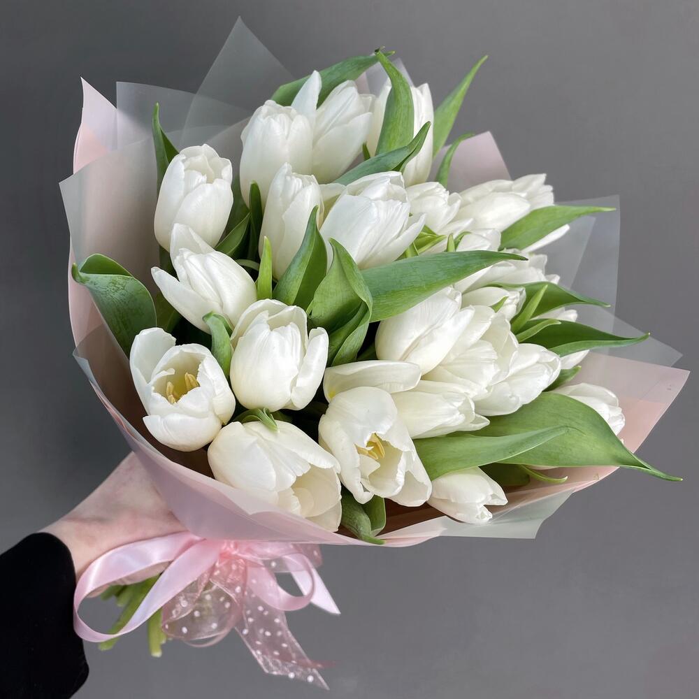 8марта 💐 Букет девушке из 25 белых хрустящих тюльпанов в Гулькевичах