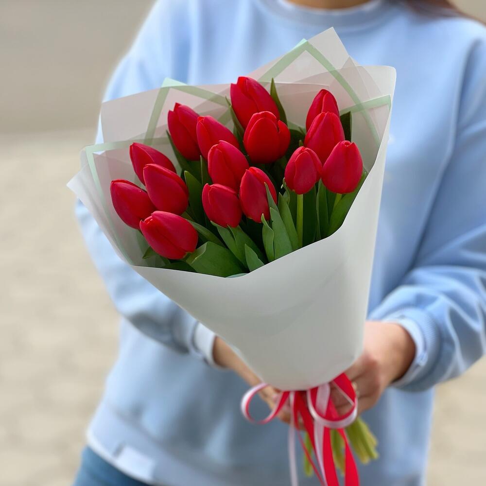 Букет 15 красных тюльпанов, весенний яркий букет из тюльпанов, тюльпаны в Гулькевичах