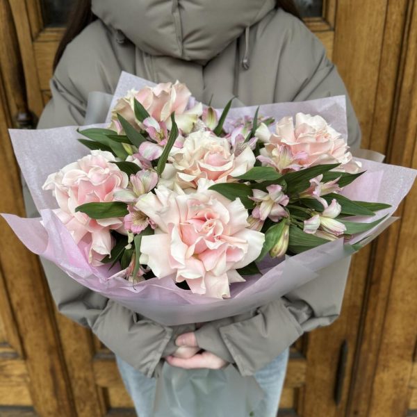 Букет из розовой французской вывернутой розы со стойкой альстромерией (сб 114) в Гулькевичах