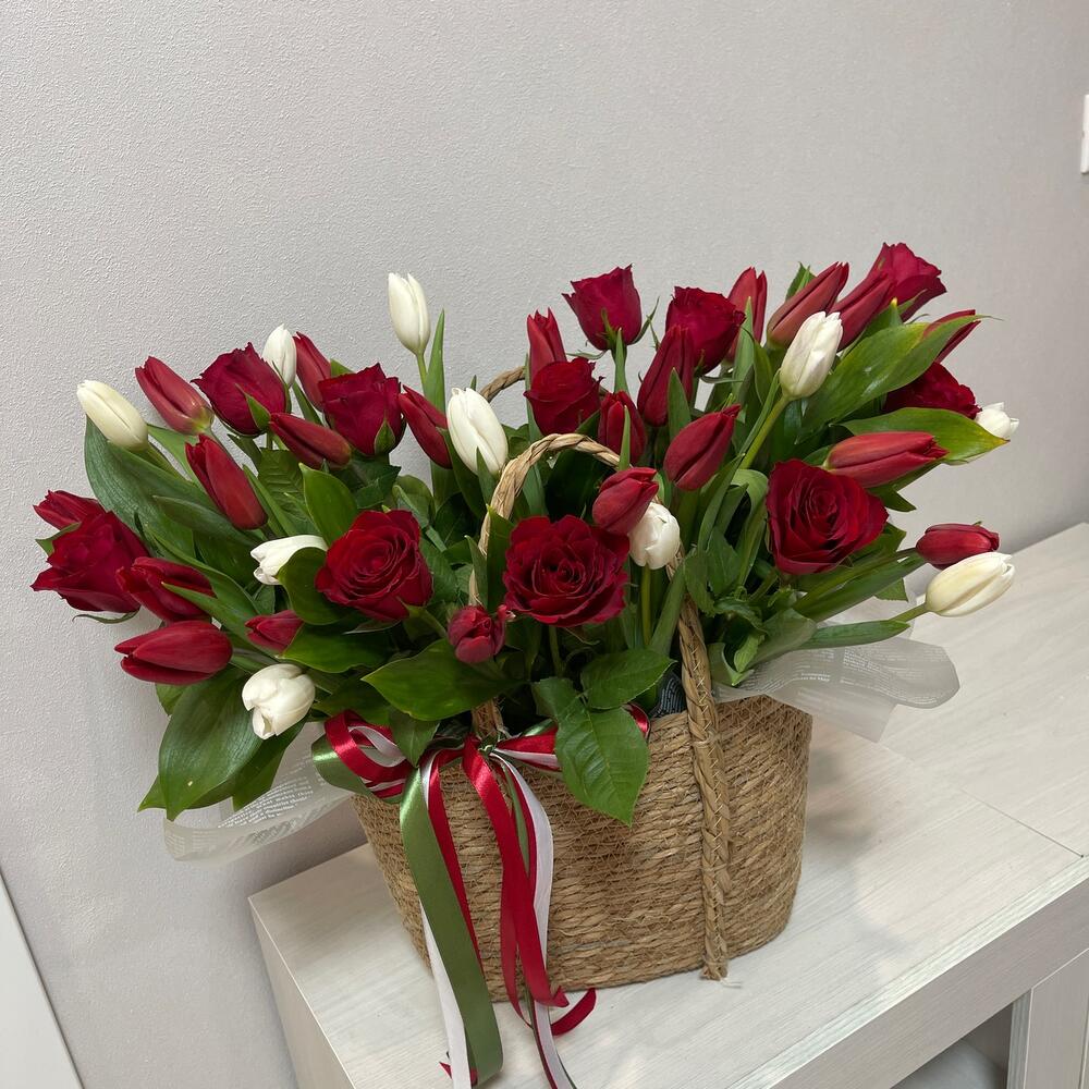 Тьльпаны и Роза в корзине 60 СМ ШИРИНА ВЫСОТА 50 СМ в Гулькевичах
